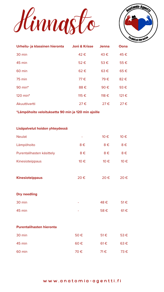 Anatomia-Agentin palveluihin kuuluvat eri pituiset urheiluhieronnat, klassinen hieronta, dry needling -neulahoidot, purentalihasten hieronnat ja kinesioteippaukset.